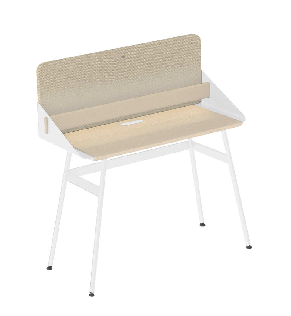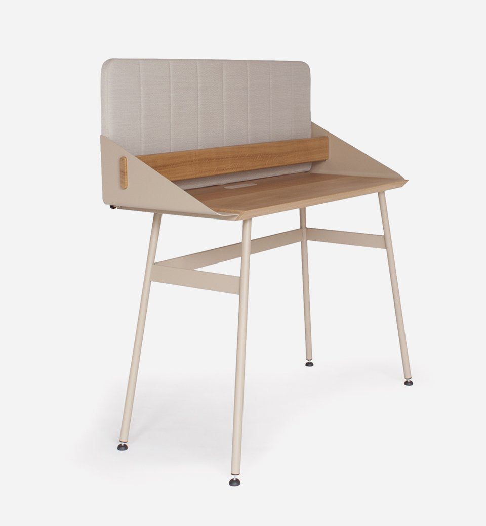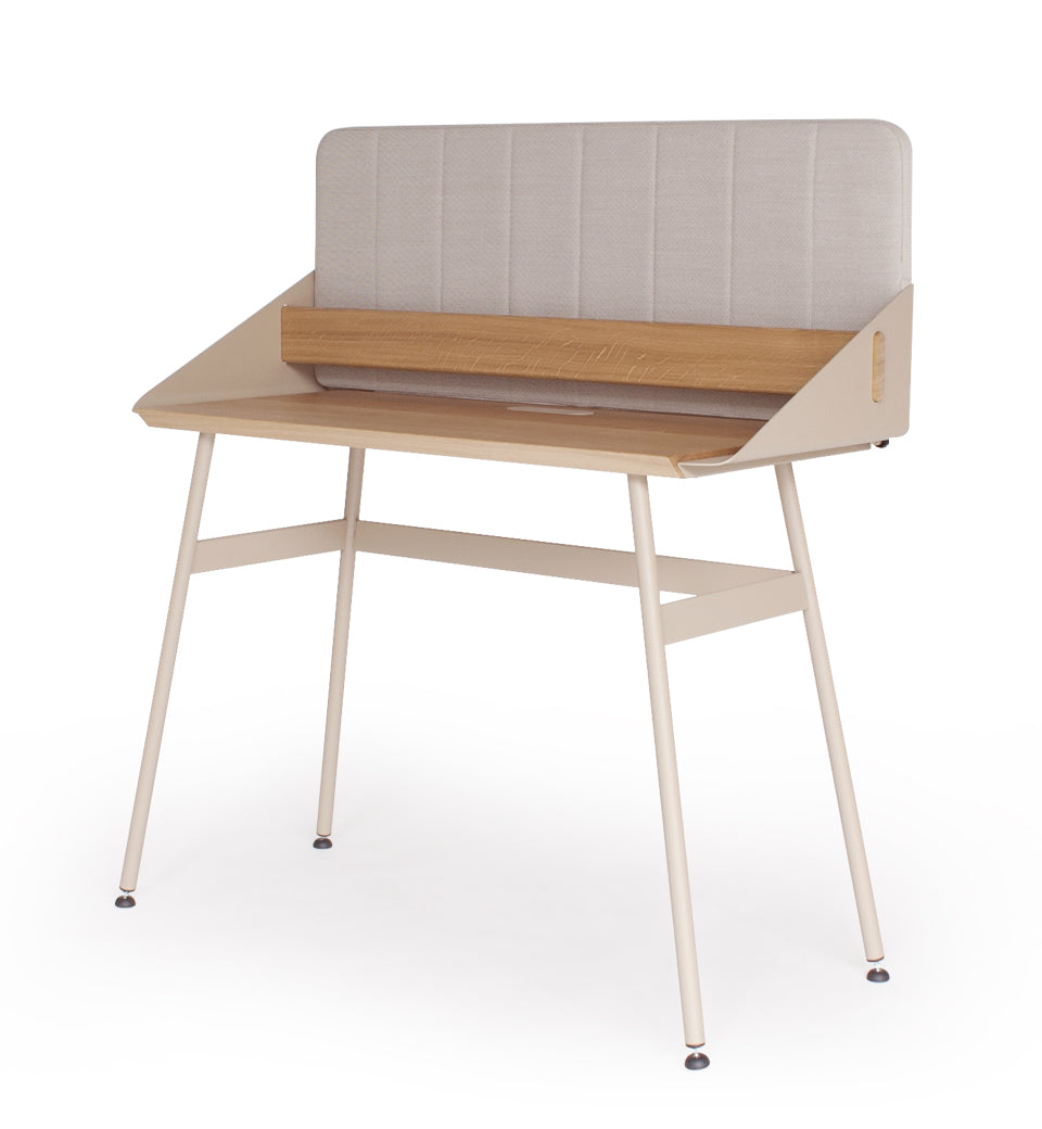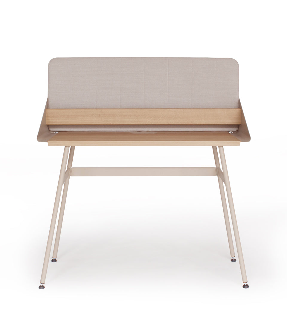 The detachable panel has various useful functions and besides ‘partial’ privacy, it offers a memo function as well as acoustic benefits. The wall panel is upholstered in elegant Kvadrat Steelcut Trio 3 fabric.