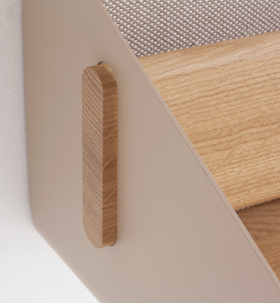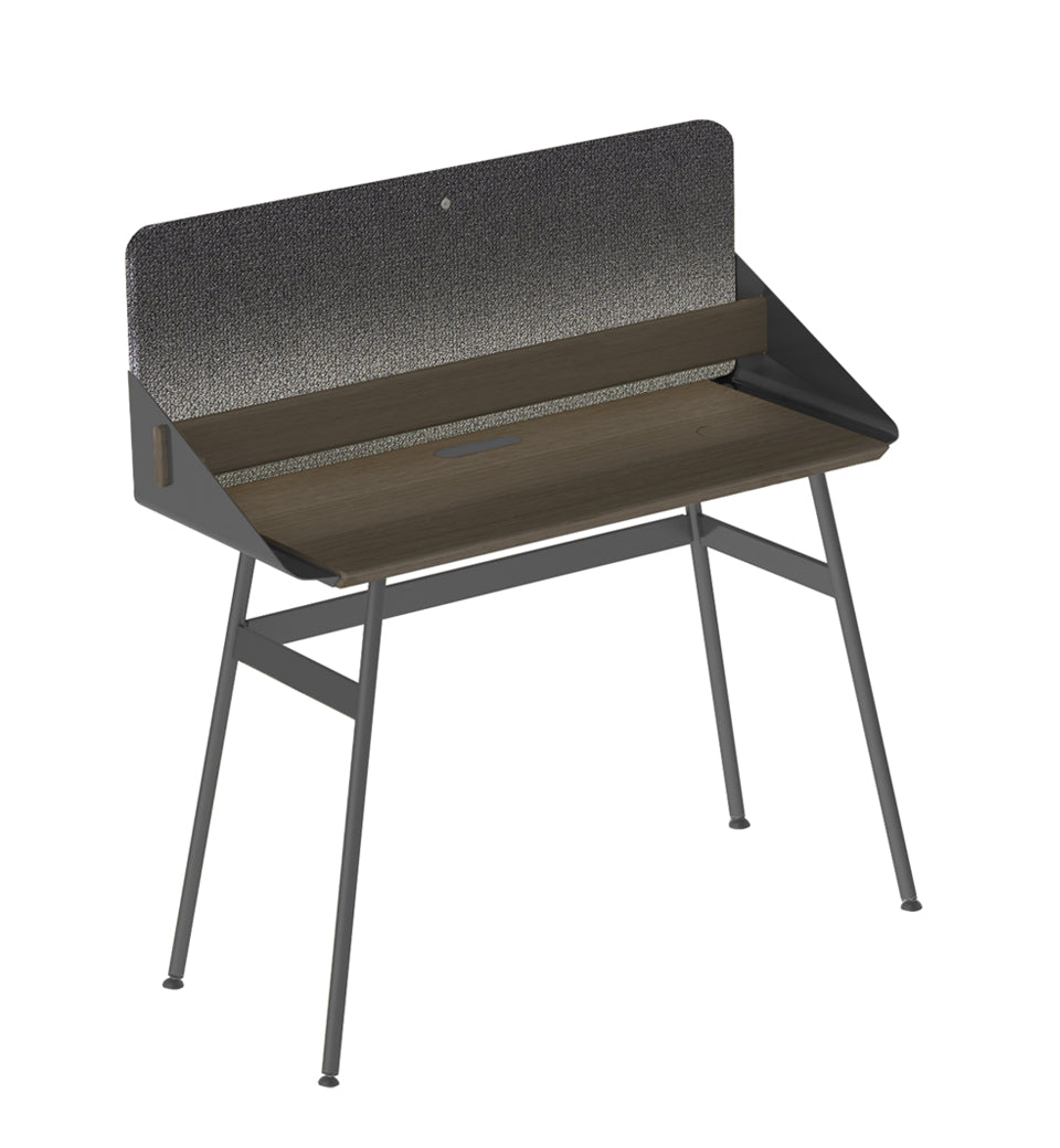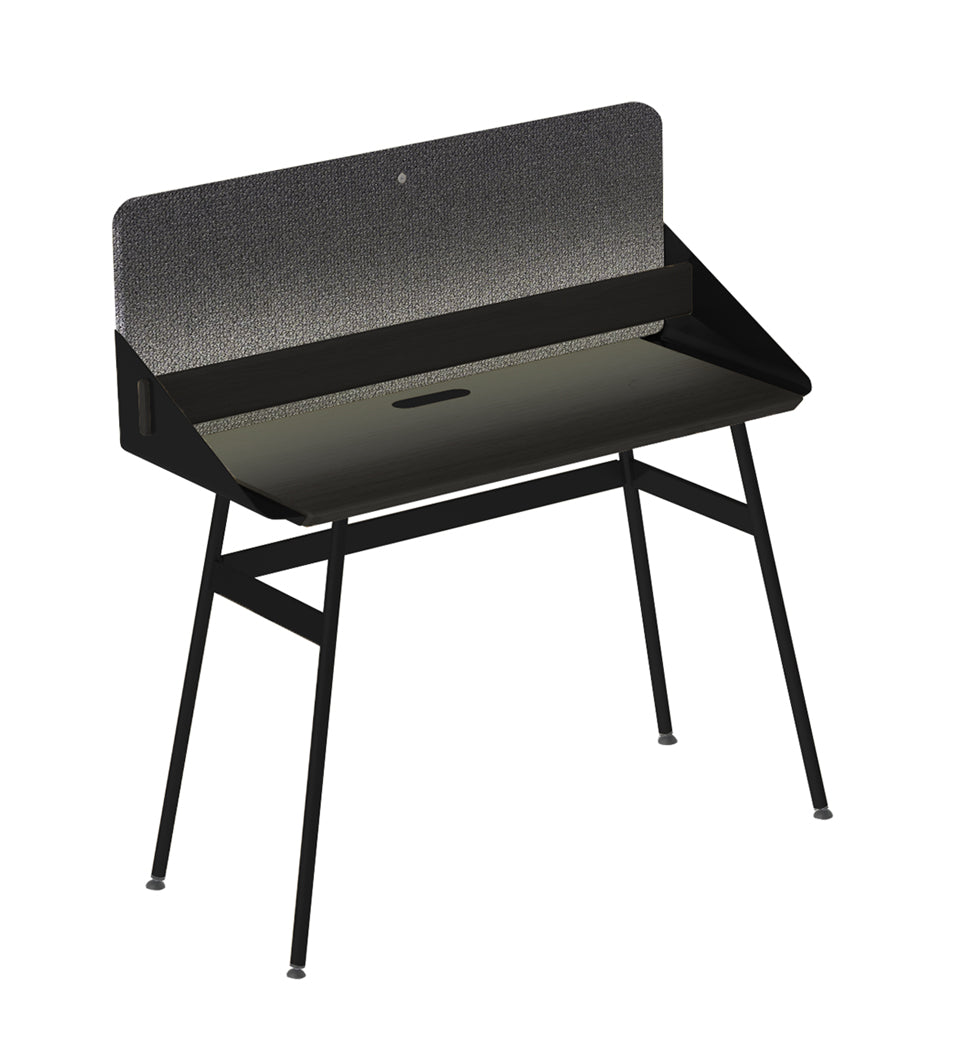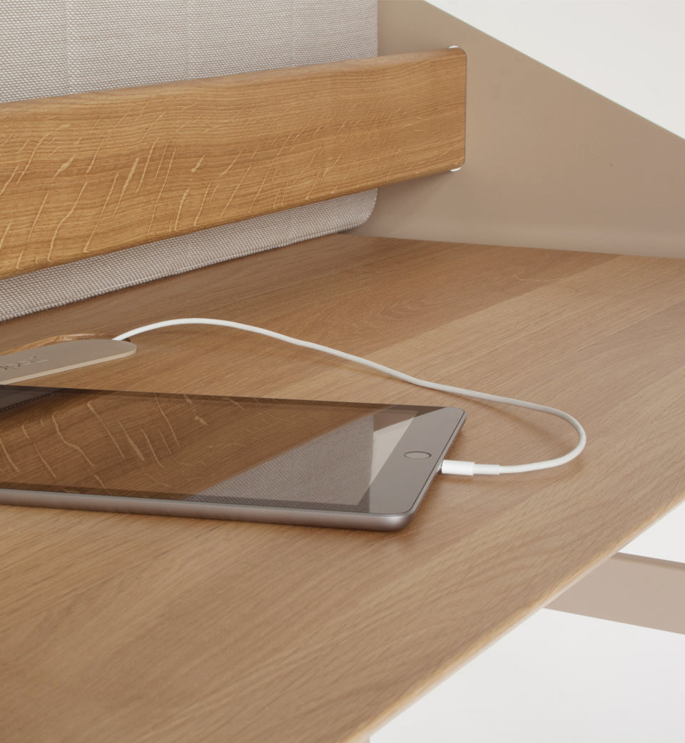 The detachable panel has various useful functions and besides ‘partial’ privacy, it offers a memo function as well as acoustic benefits. The wall panel is upholstered in elegant Kvadrat Steelcut Trio 3 fabric.