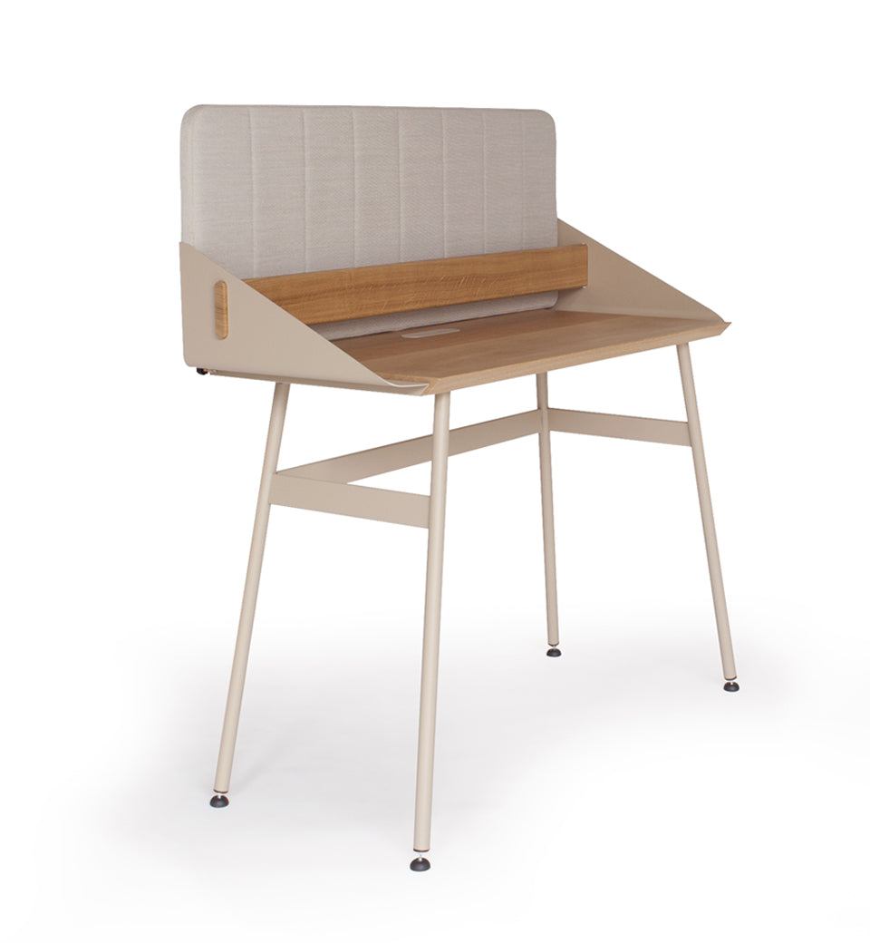 The Timeline series at home or for a project – The TimeLine Desk & Wall desk shown here is upholstered in Kvadrat Steelcut Trio no. 213 fabric and has a champagne colour frame.