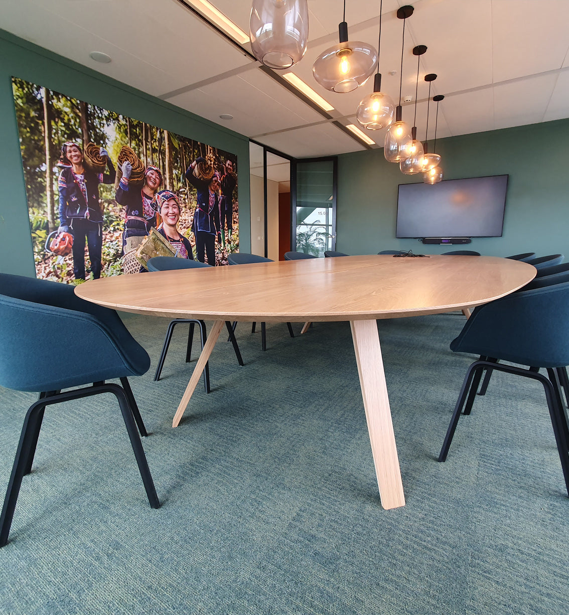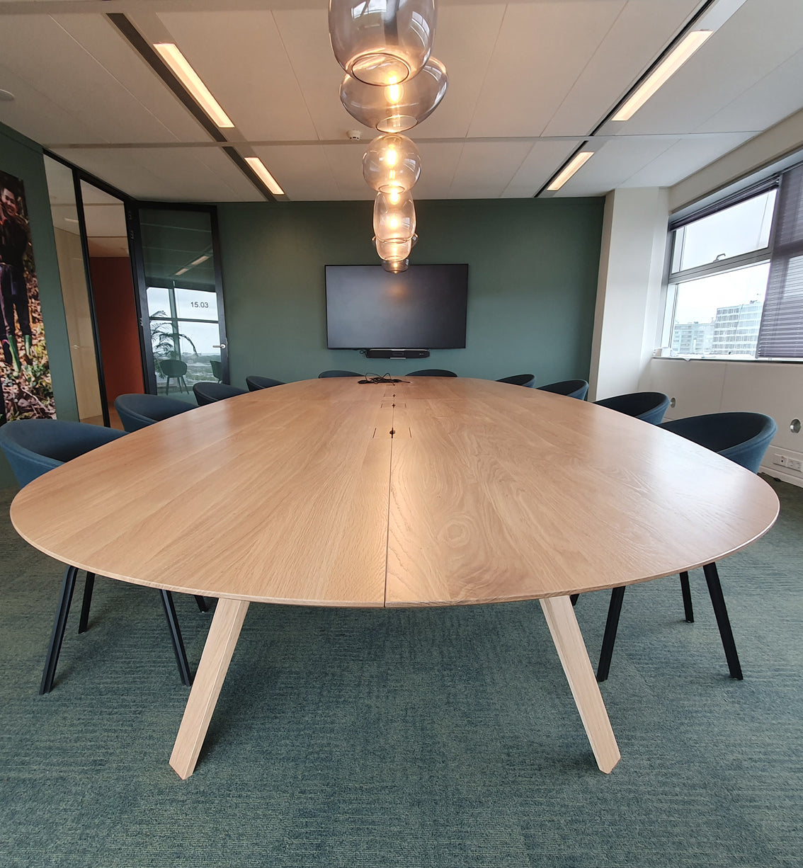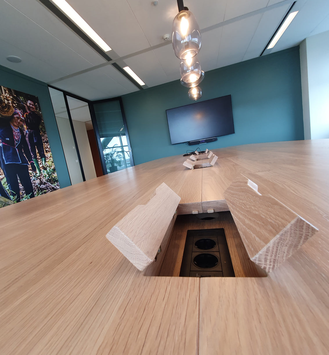 You can add a discreet outlet for cables in the center of the table.